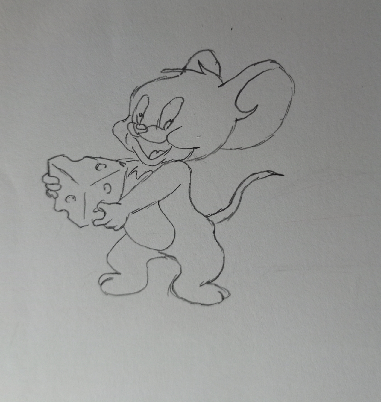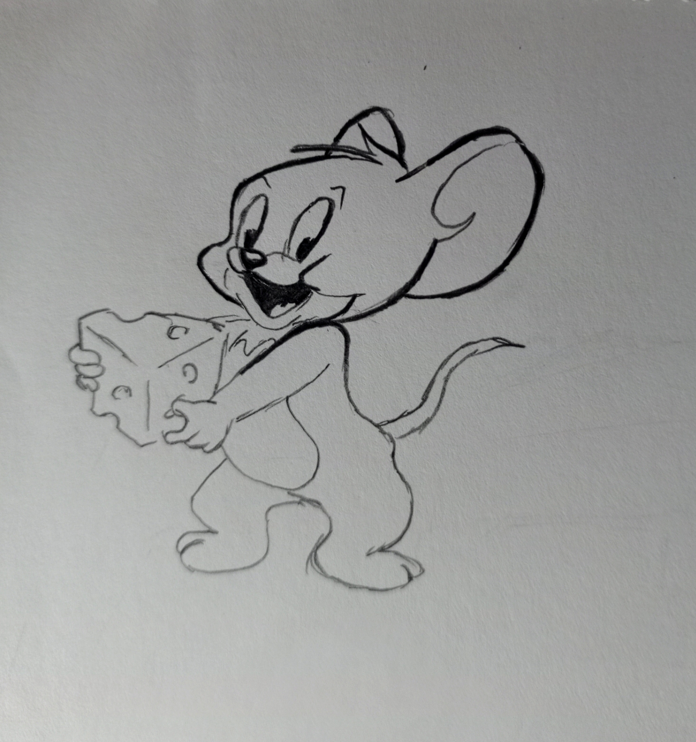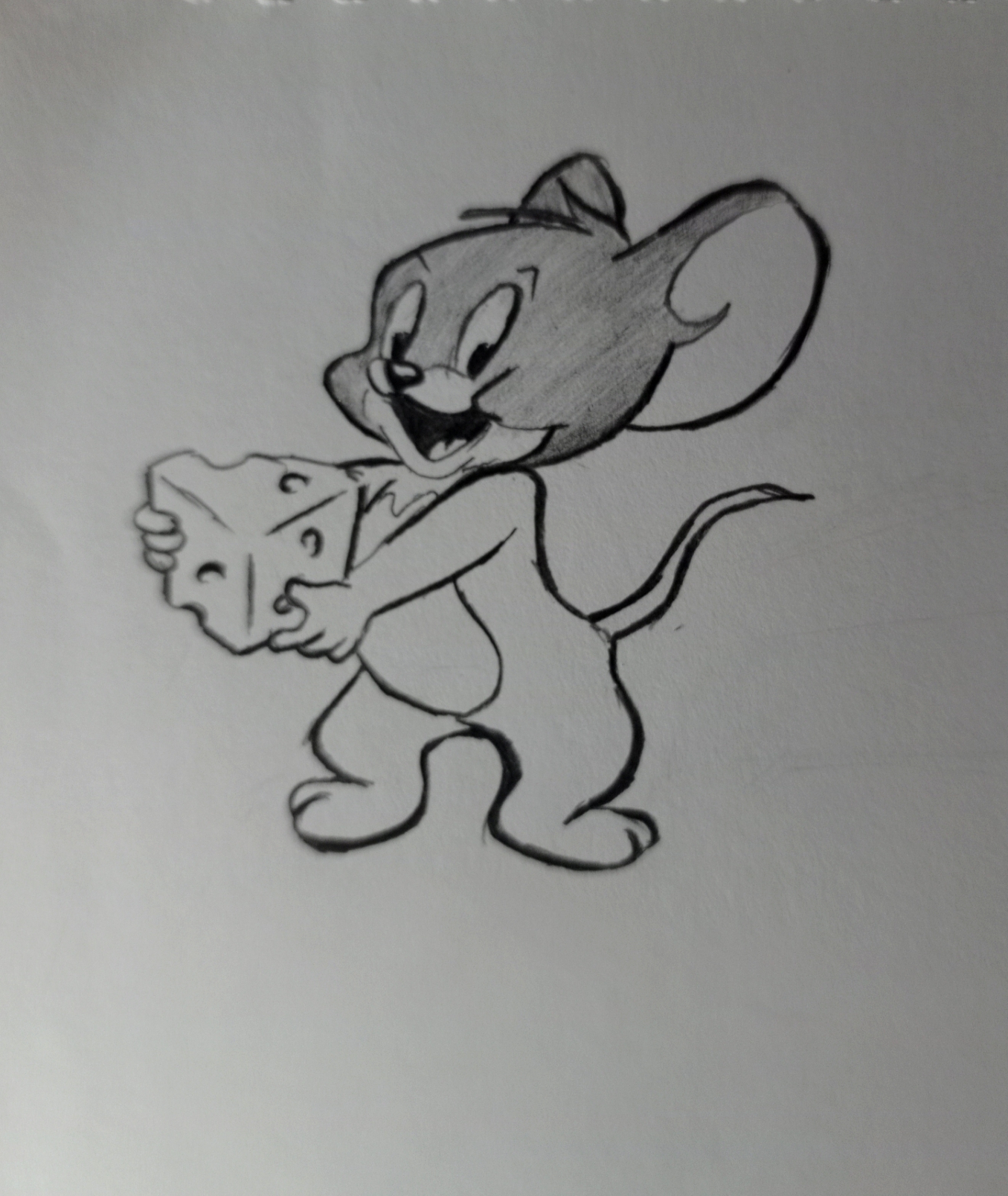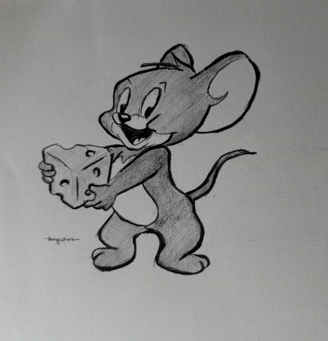 Let me share my art with you, tom as a tiny mouse, clutching his food like treasure. A playful sketch that brings back the fun and chaos of classic cartoon.