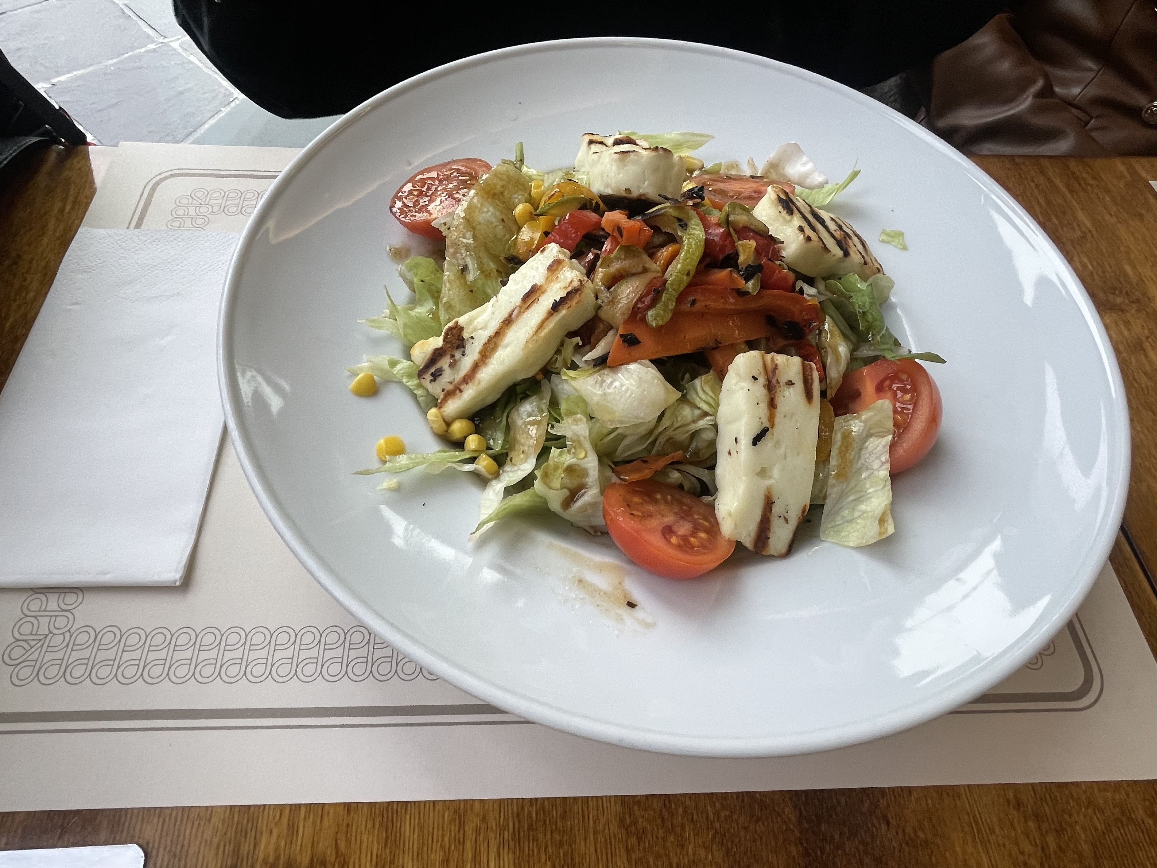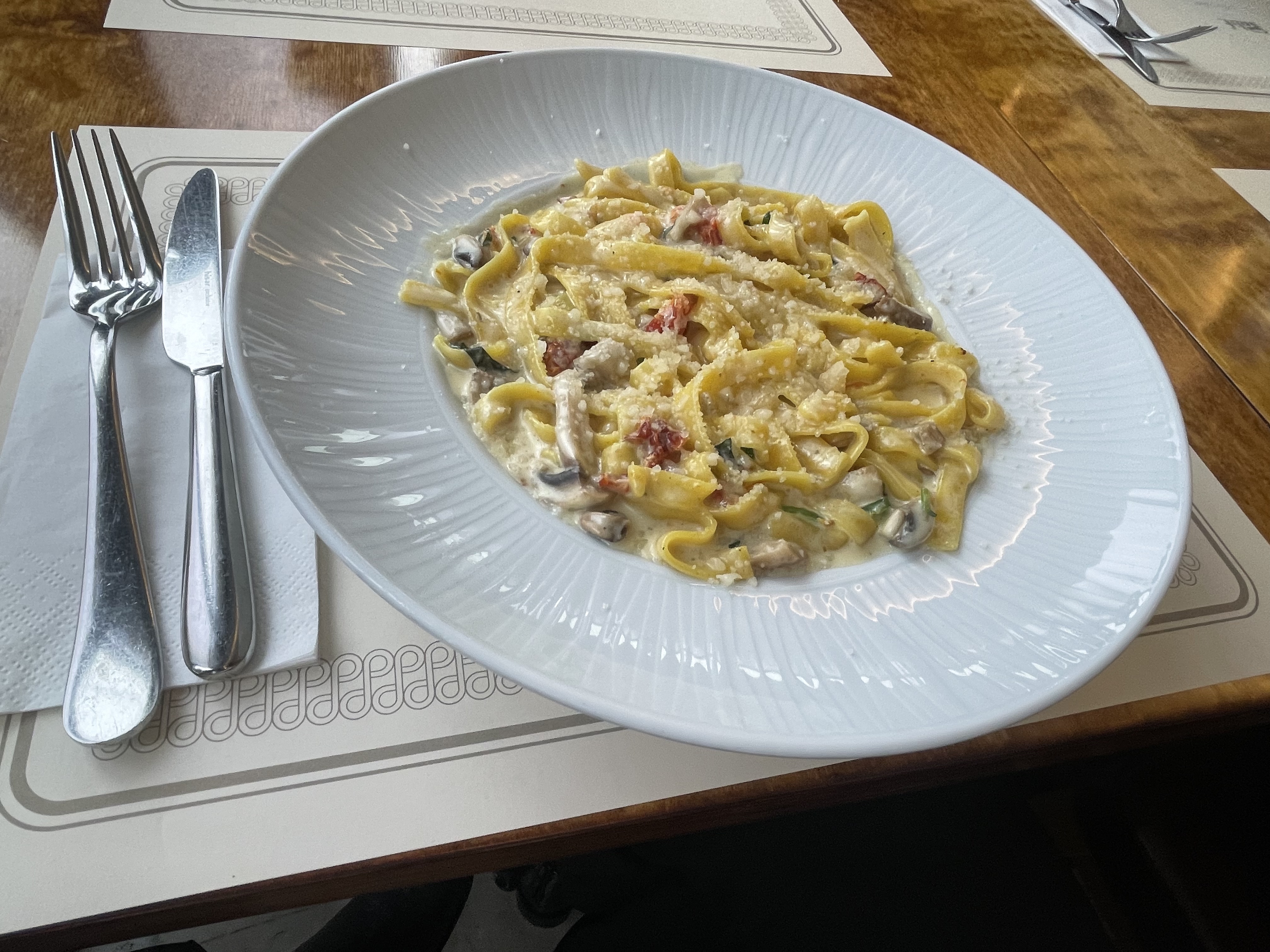 One of my friends also ordered pasta, but a different kind. The sauce looked creamy too, and the pasta shape was different. We compared plates like we were food critics (but very friendly and not serious). Another friend chose a chicken salad. It looked colorful and healthy, with grilled cheese pieces, tomatoes, and greens. It was the “fresh choice” on our table, and it looked really good.