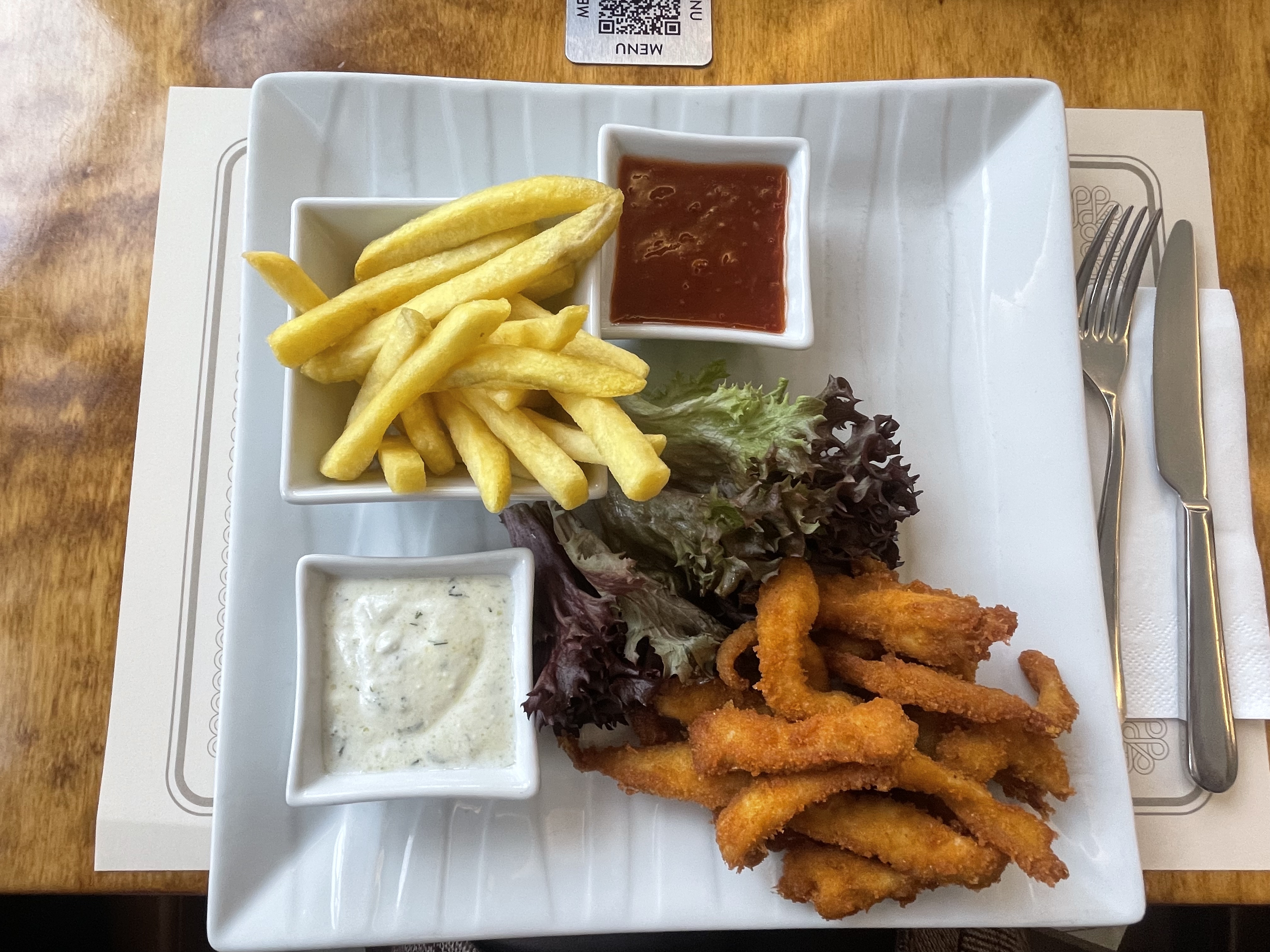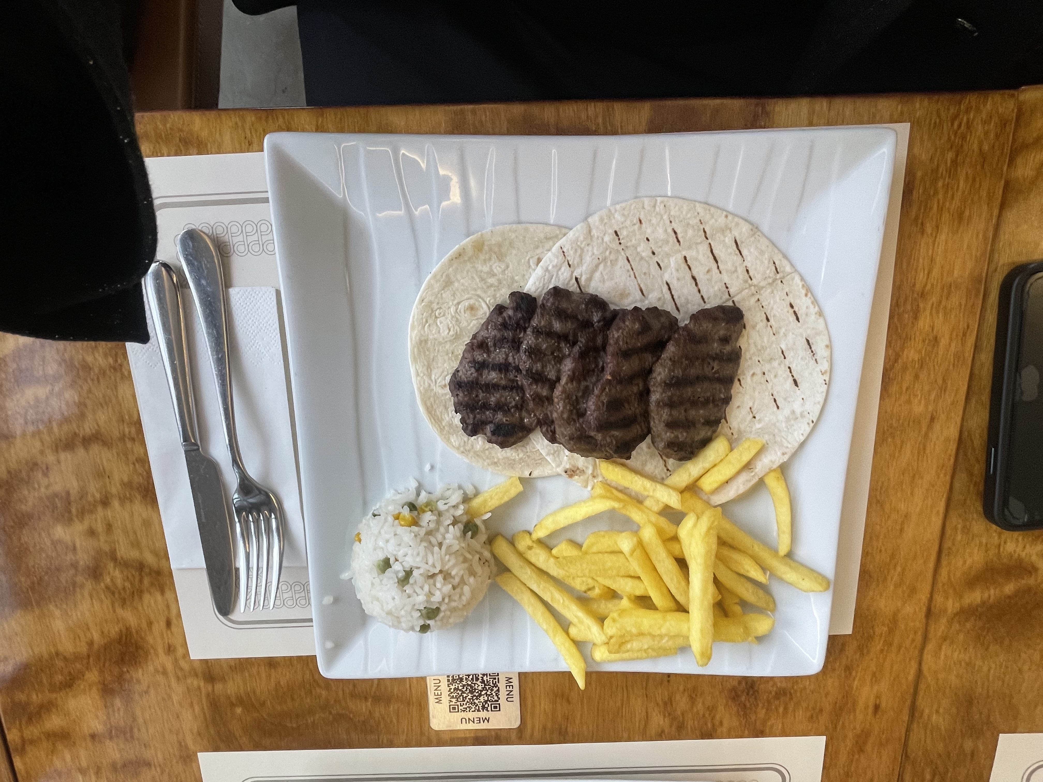 Two of my friends ordered meatballs with rice and French fries. The meatballs were grilled and looked juicy, and the plate felt like a classic, satisfying meal. And another friend ordered fried chicken pieces with fries and sauces. The chicken was golden and crispy, and the fries looked hot and perfect for sharing (even if everyone said, “I will not share,” like a joke).
