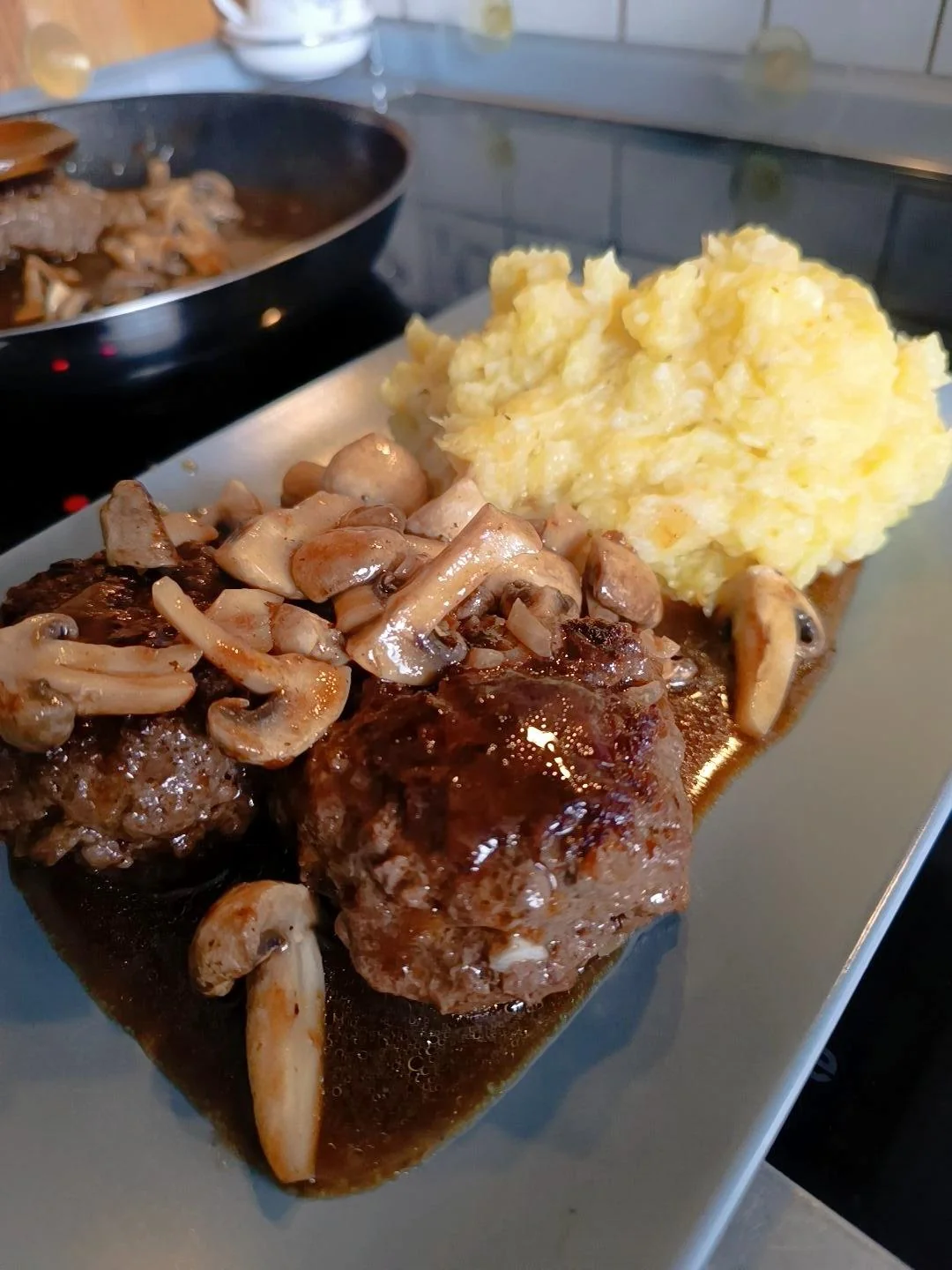 Meatballs with mushrooms and potato-celery puree