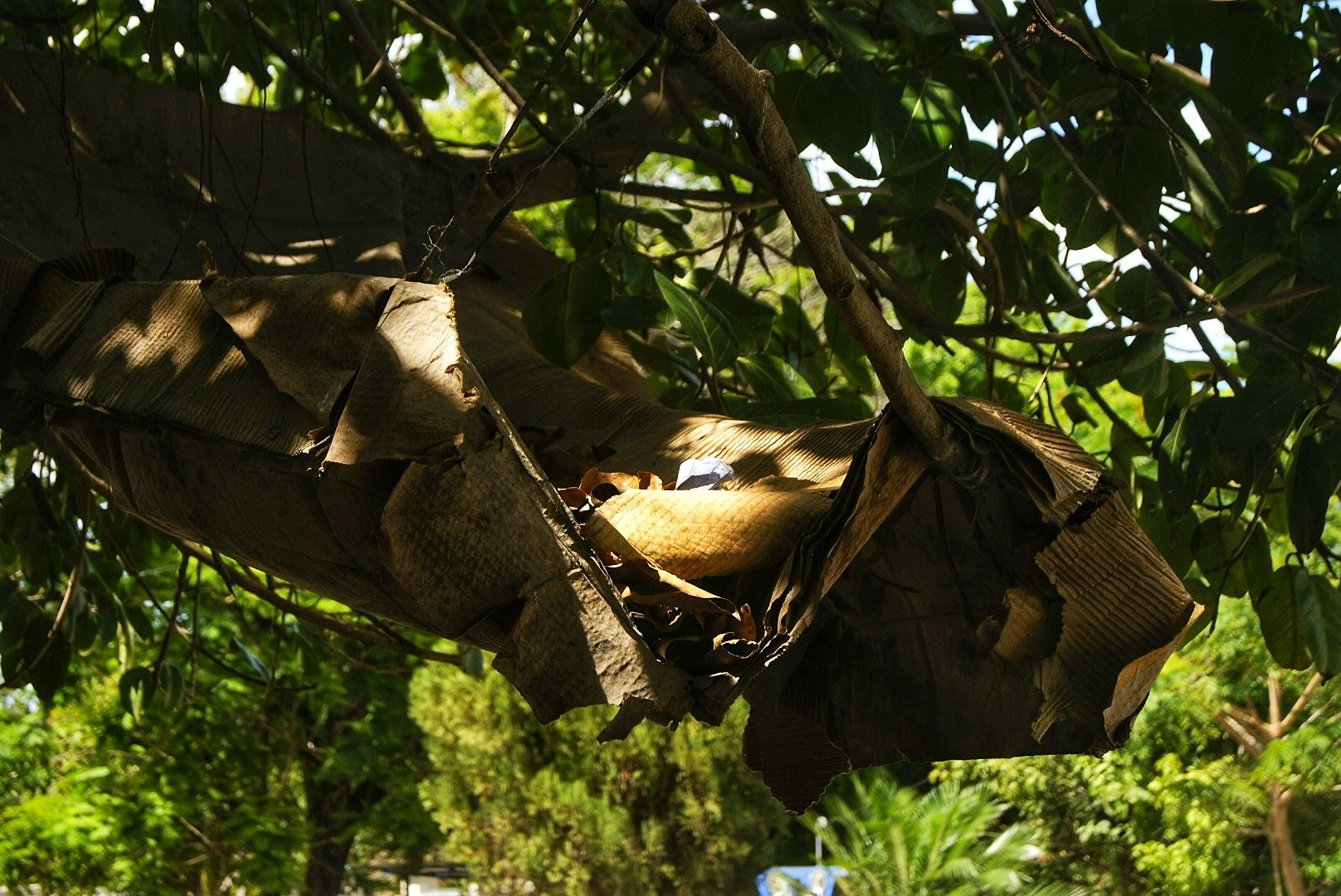 It's strange how that ended up there: a piece of cardboard with trash on top, perched on a tree. While I waited for an electric tricycle, I wanted to take photos; street photography makes me feel a bit shy, so I divert my attention to details—odd, natural, misplaced in a sway of possibilities.