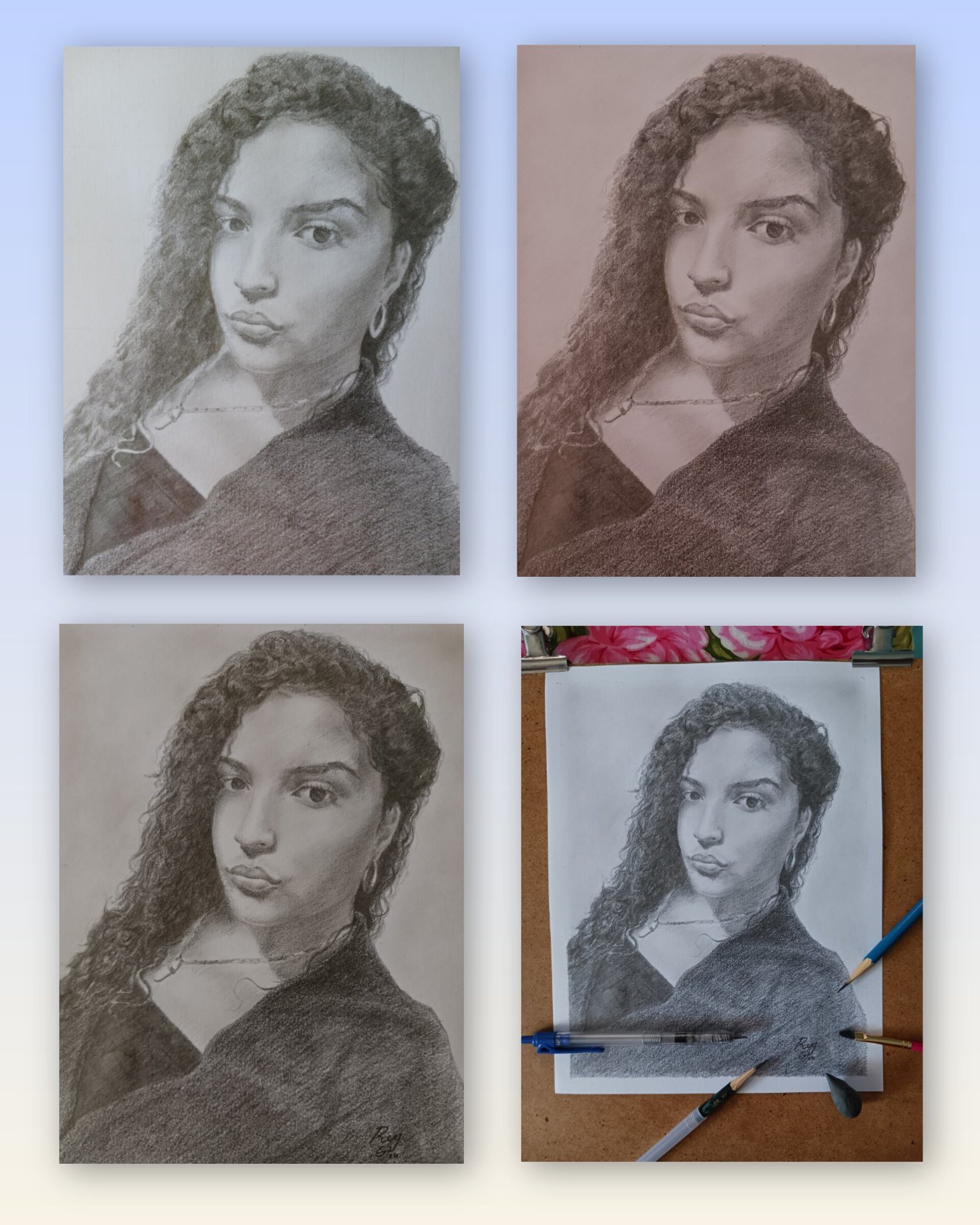When I draw portraits, I make a grid that allows me to outline the face to be more similar to the model. Then I begin to outline and structure with light strokes, which I progressively darken and add different tonal values to give volume and make it possible to appreciate the lights and shadows. During the creative process, I make corrections if I see any flaws, and then I begin to define and highlight areas like the eyes, mouth, and the tricky hair. Also during the creative process, I use the dry brush to blend areas of the skin (although later, I cover some of those areas with chiaroscuro) and to create the background