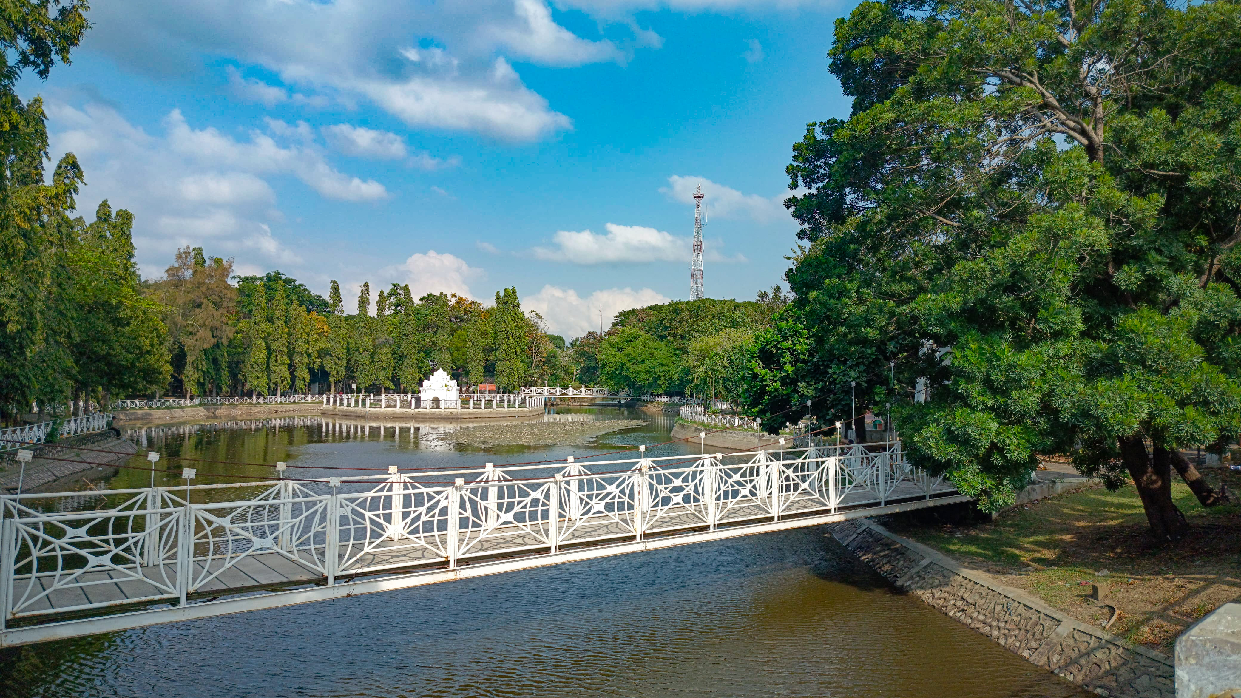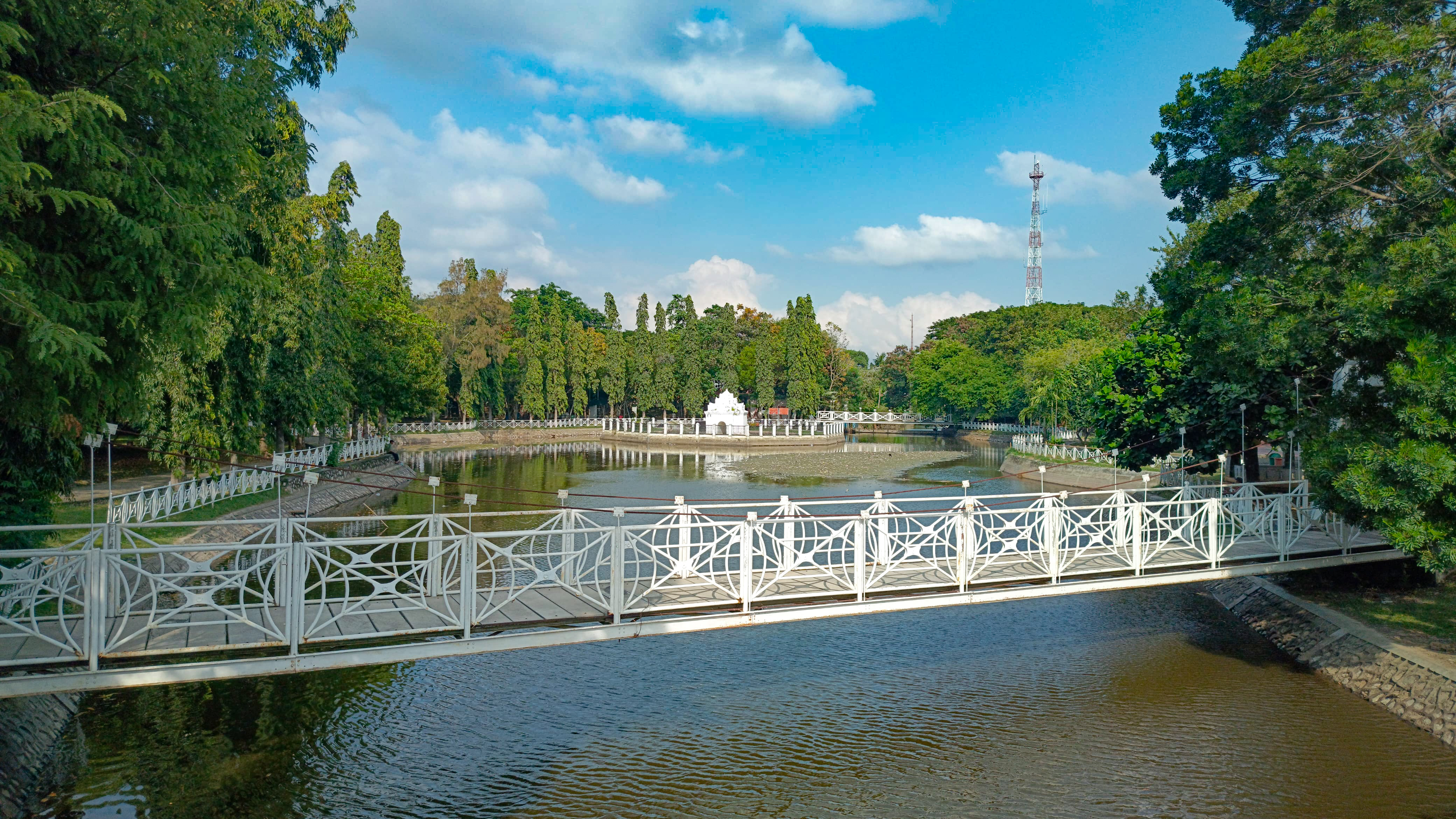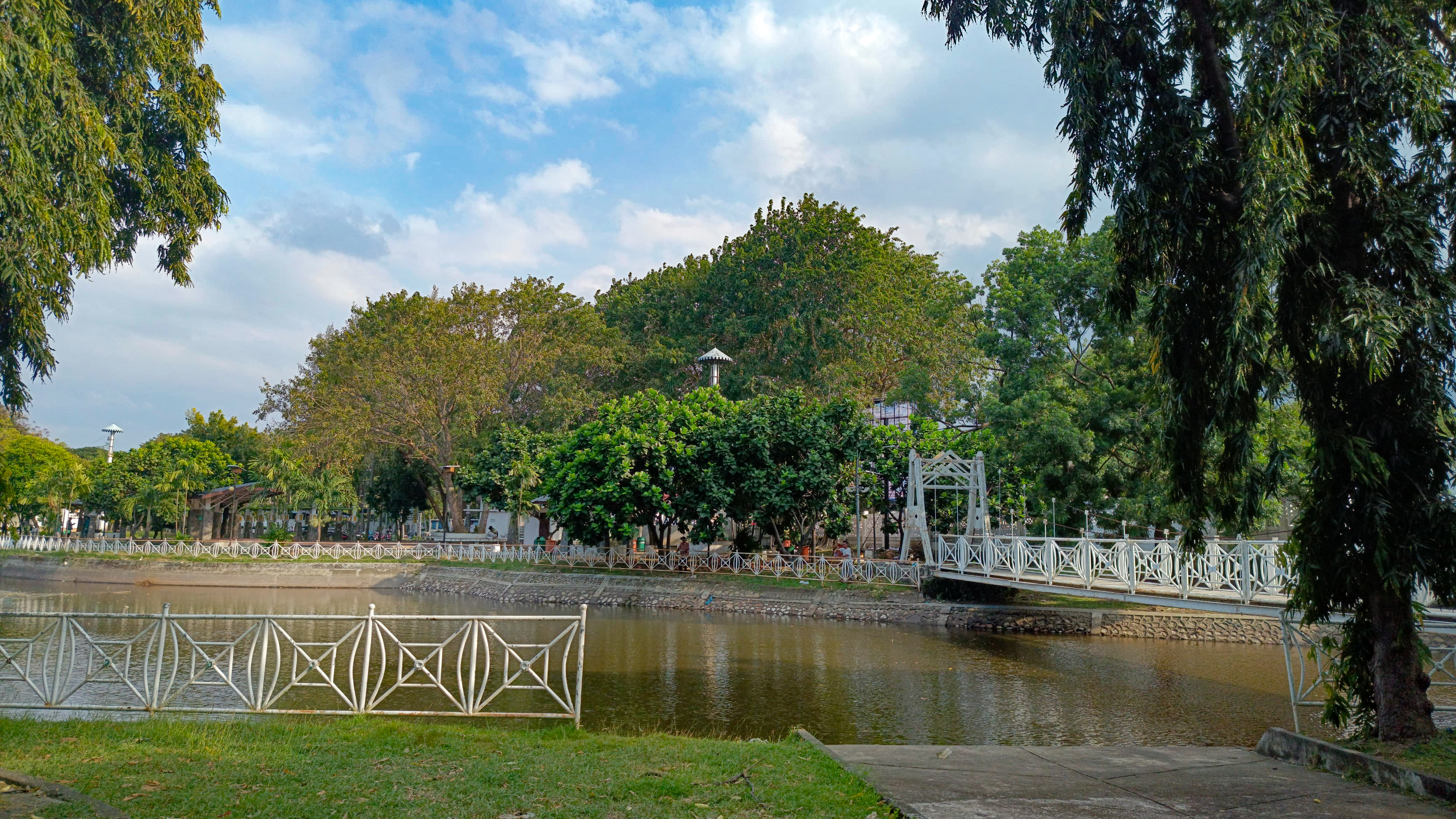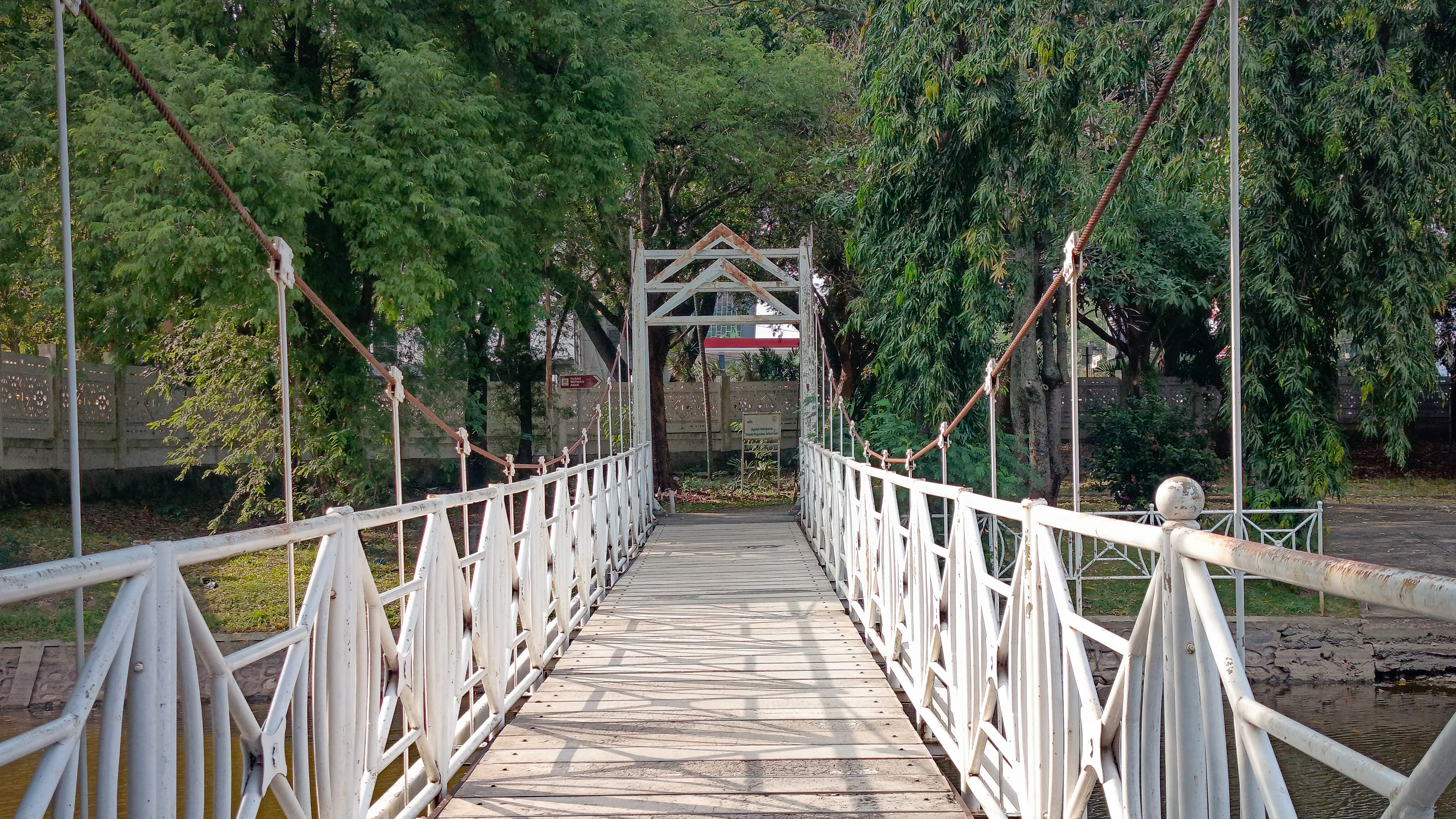 I continued walking and arrived in front of a white bridge which is a connecting bridge to this park, because this park is very large and there is a river in the middle of it so this bridge is a bridge for people who want to cross the river.