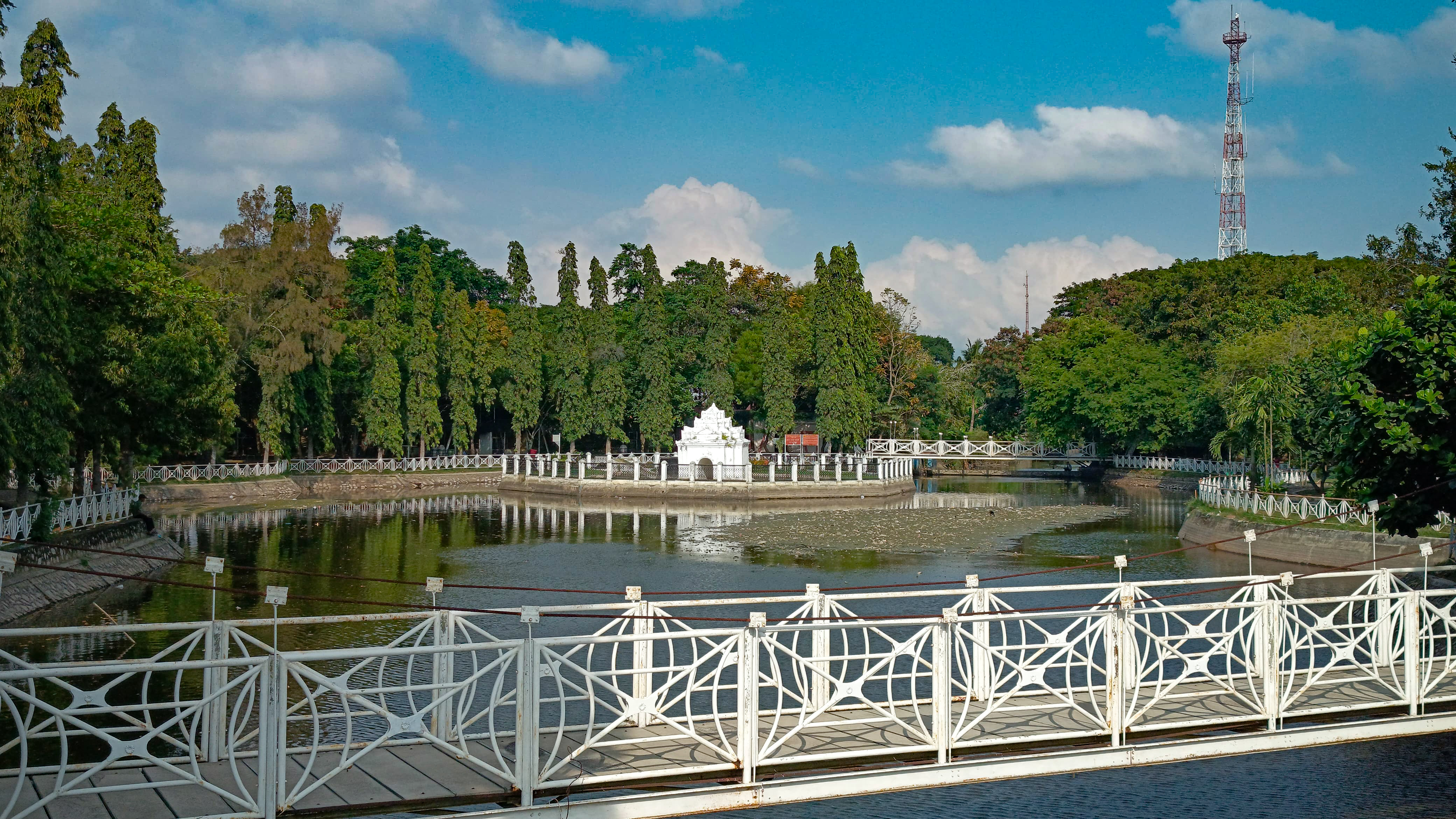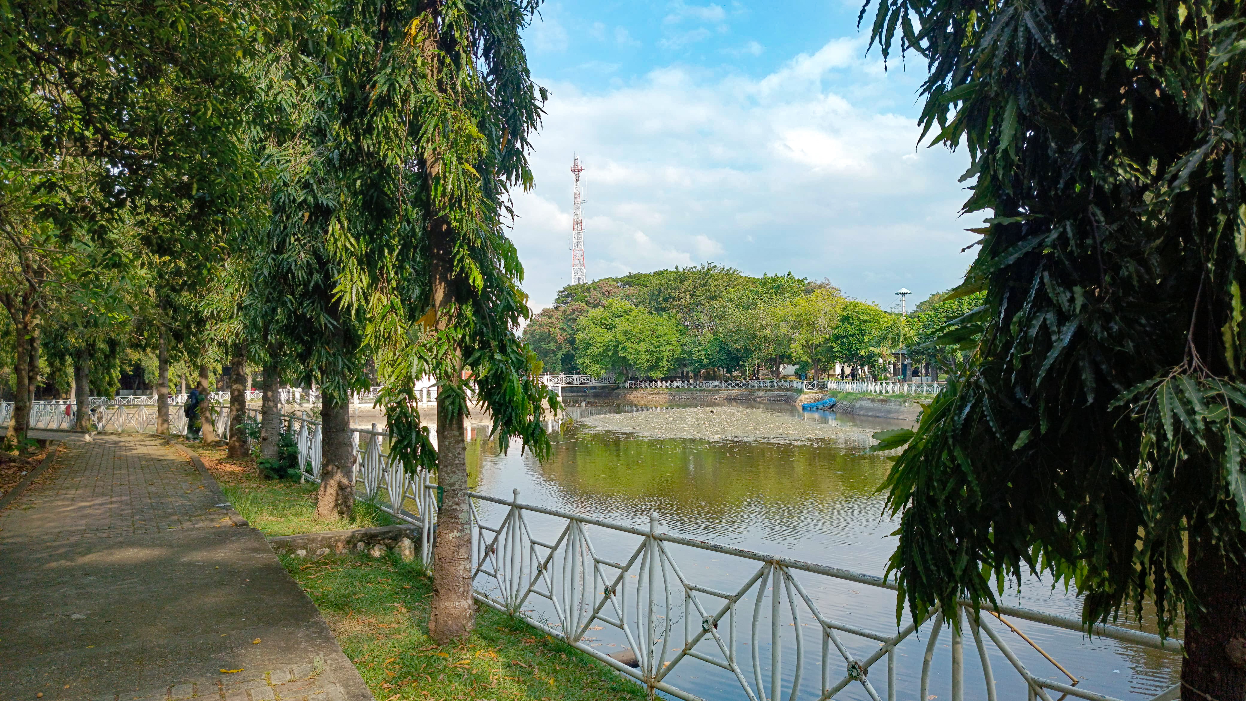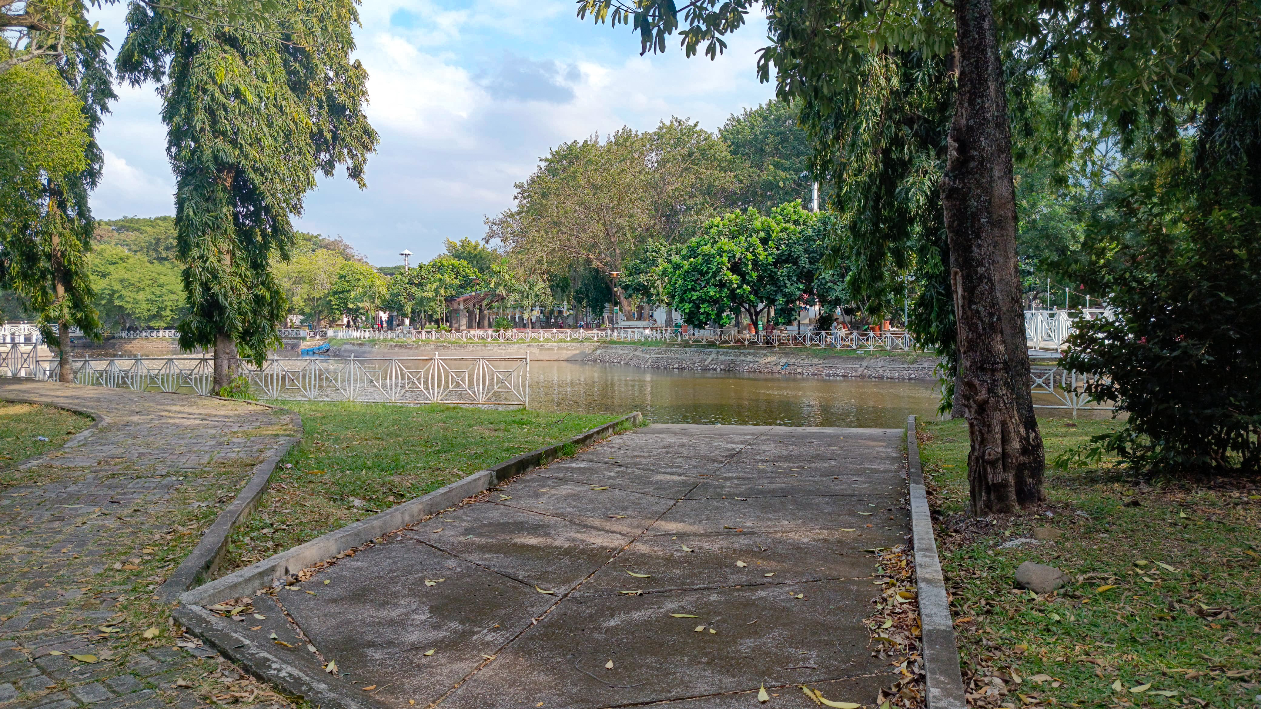 I continued walking and arrived in front of a white bridge which is a connecting bridge to this park, because this park is very large and there is a river in the middle of it so this bridge is a bridge for people who want to cross the river.