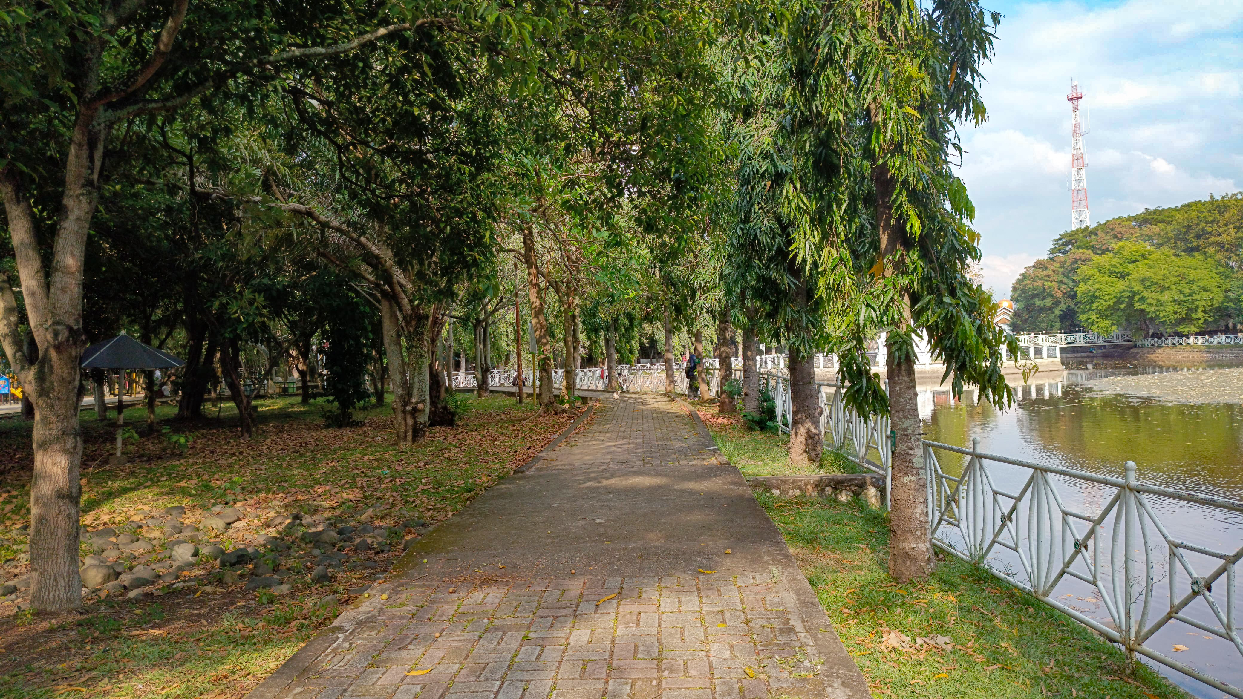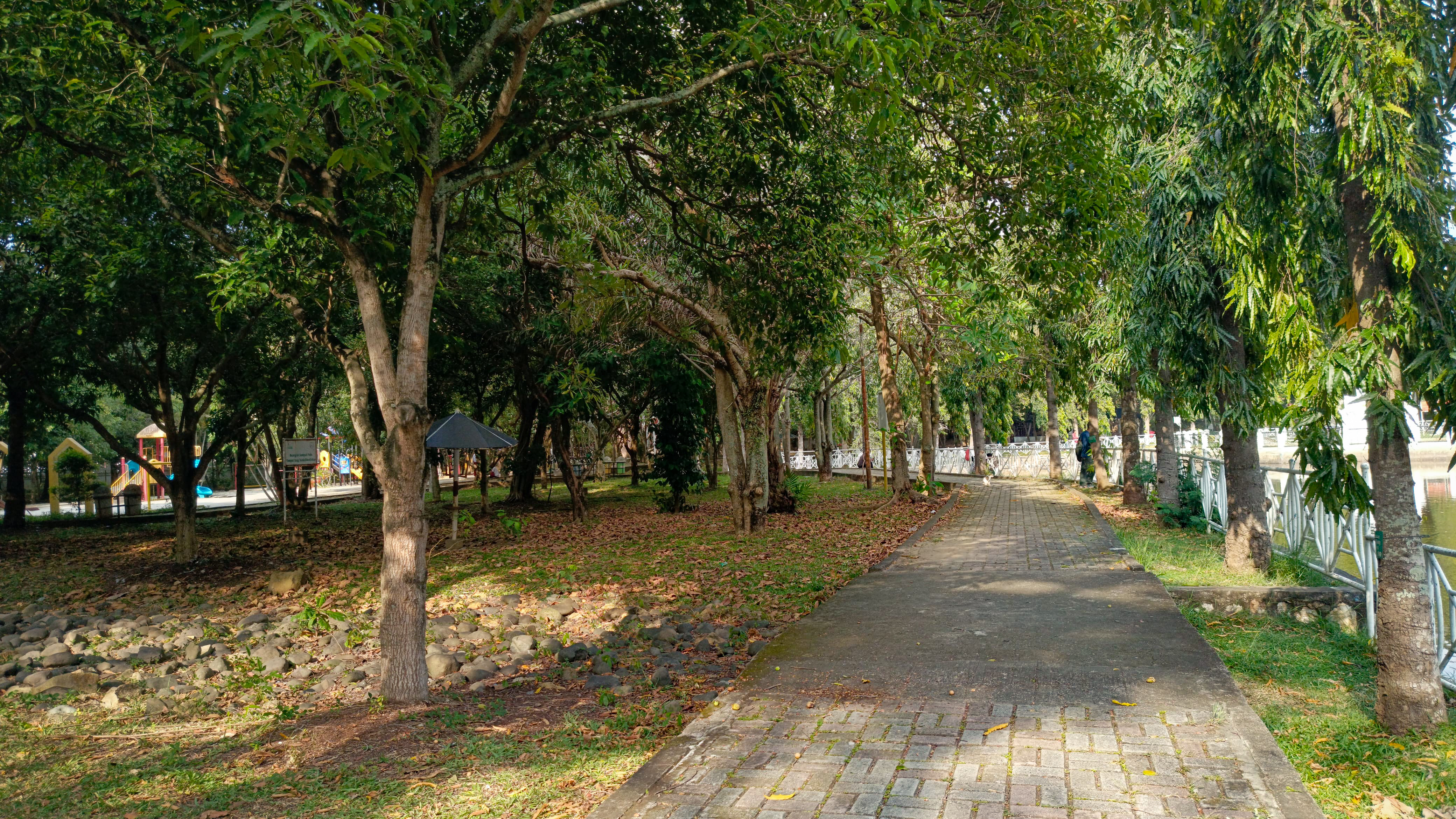 And after I managed to cross this bridge, I immediately followed the path that had been provided in this park, and what I like most about this park is that there are so many big trees that make the atmosphere around the park feel cooler and calmer, the cold air continues to hit my body so that it makes the atmosphere very pleasant.