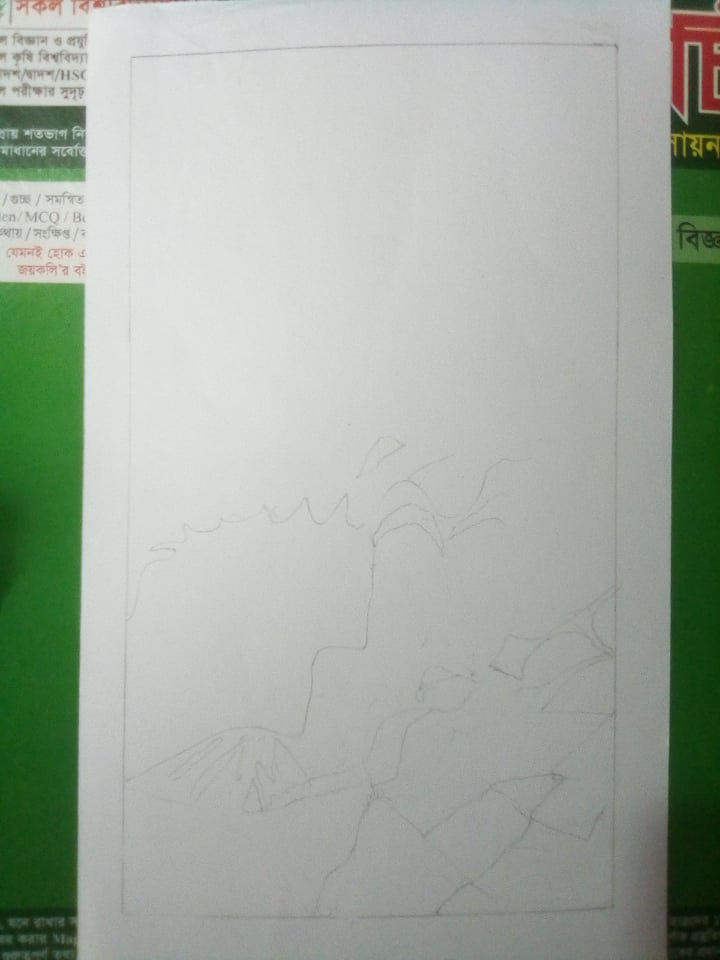 I made a light sketch with 2B pencil on an art paper. I brused on the paper with black color then draw the broken cornice of the old building. I used water color and a brush. I tried to make the art realistic. So I tried to make difference between new and old leaves of trees by using light and deep colour. I tried to highlight the sunshine on the leaves.