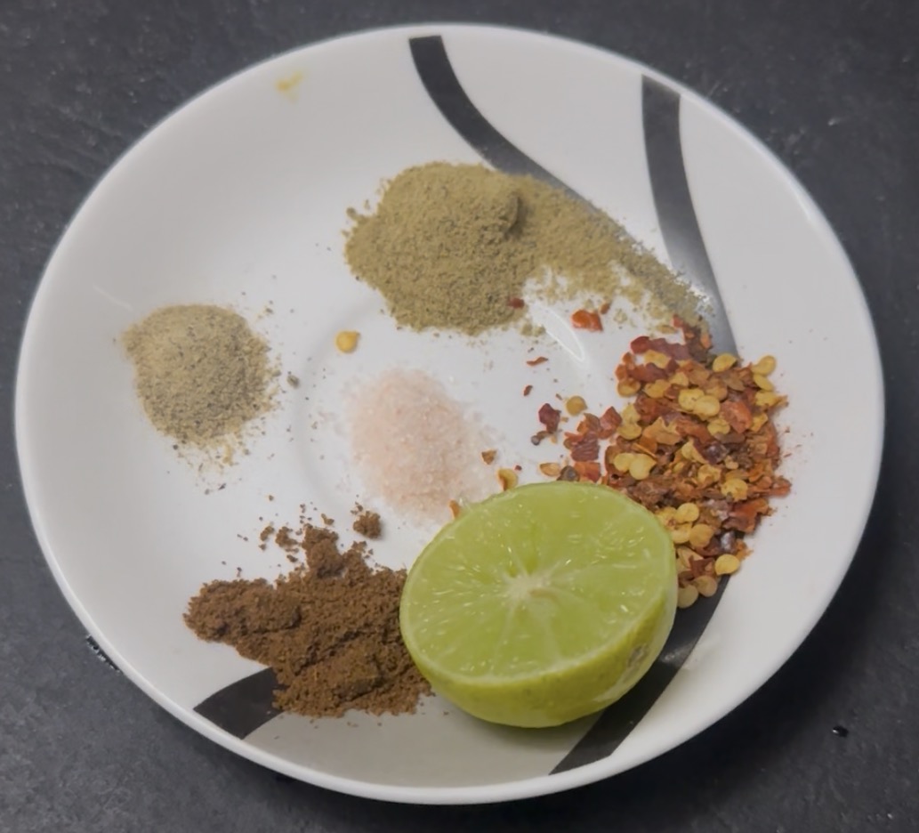 (black pepper powder, black salt, chaat masala, and chili flakes)