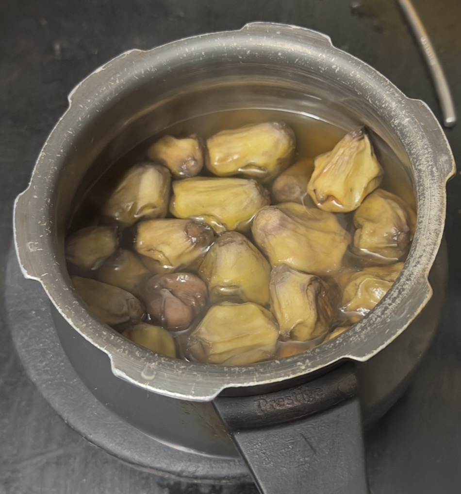 Then, add water to the pressure cooker, add the water chestnuts with their skins on, and cook until they whistle 2-3 times.