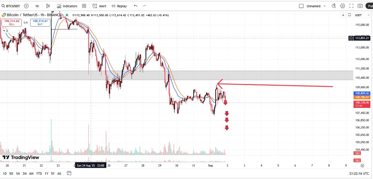 Okay! I will do this as quick as possible. I was actually expecting Bitcoin to touch $110k price again during this leg up. However, price only hit $109,907 price level and resumed the down move into lower territory.