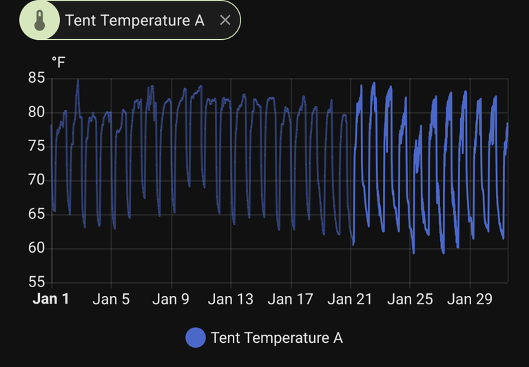 And for the tent temperature, we can see I have been keeping the tent below 85F for the most part.. Usually in the low 80s. The night time lows have been dropping into the low 60F's so I hope if the cold weather keeps up that should be enough to turn the buds purple during late flower.