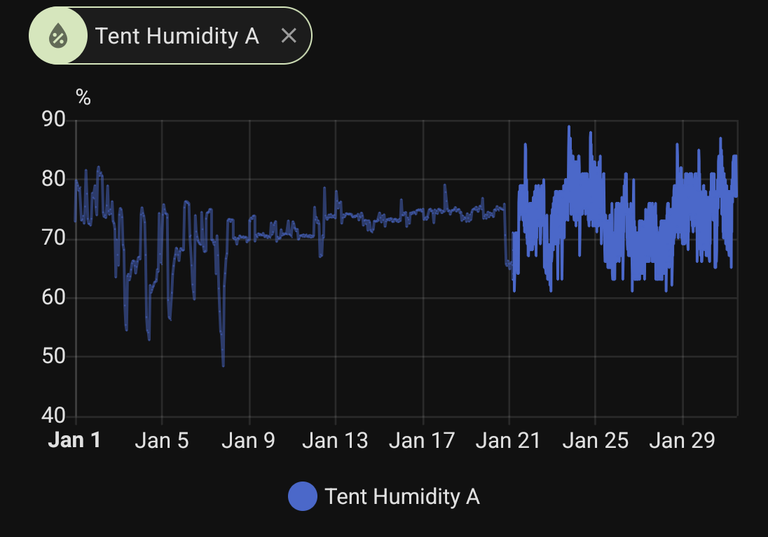 Humidity levels are tracked, high levels are usually happening at night when the fans cycle off. As i get further into flowering I may need to run the fans all the time to help keep the night time humidity lower. Those spikes on the bottom end is when my humidifiers ran dry and I did not notice for a few hours. Seems like the plants are okay with that usually.