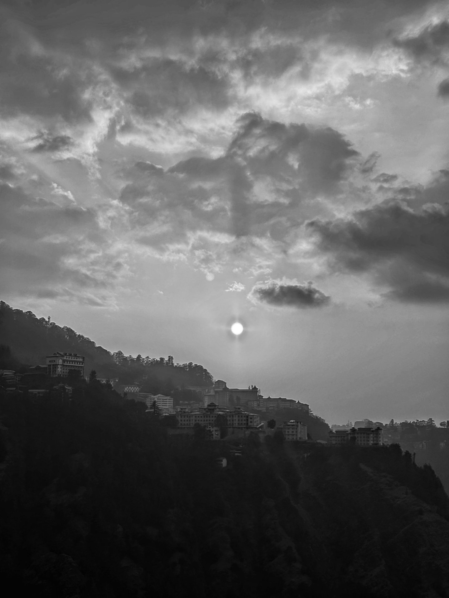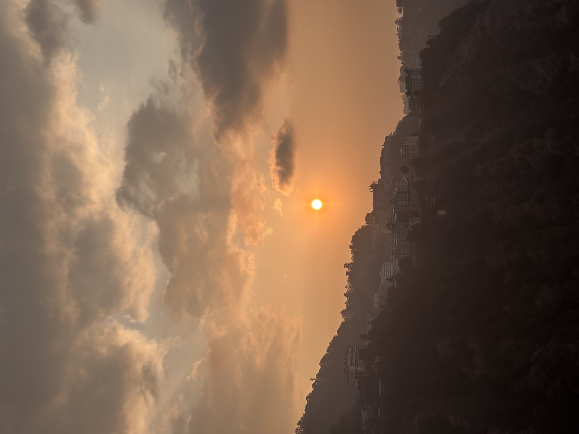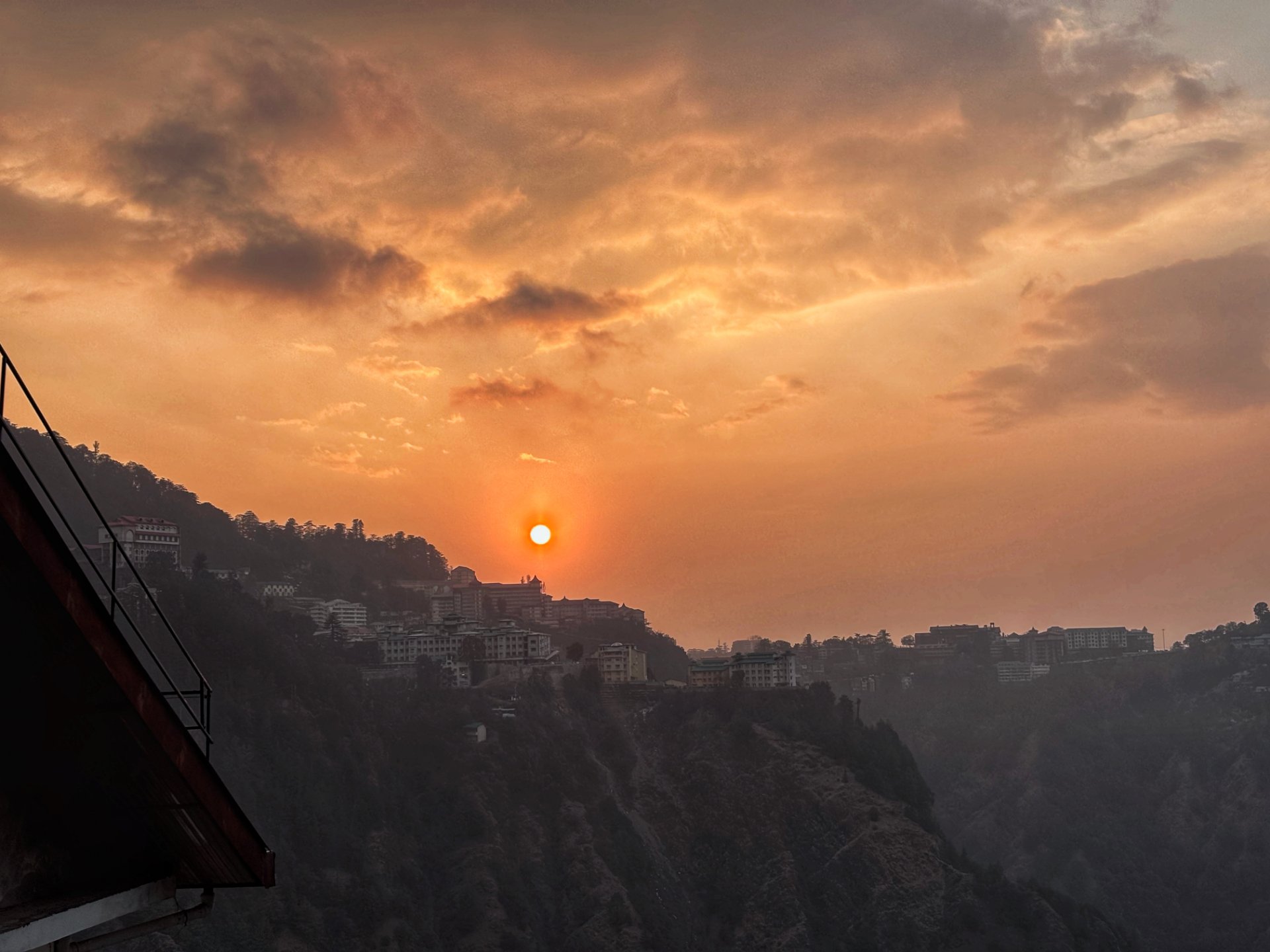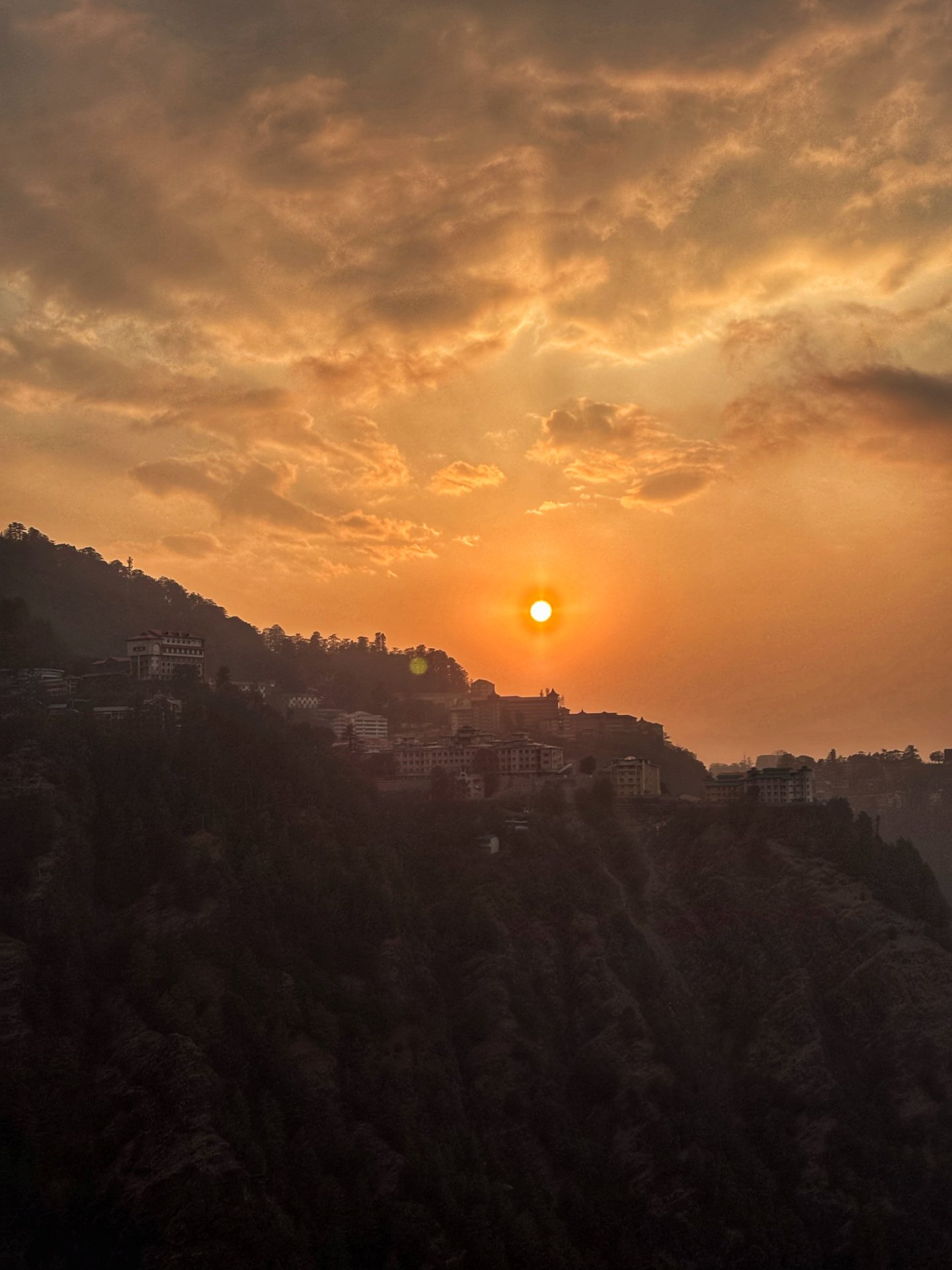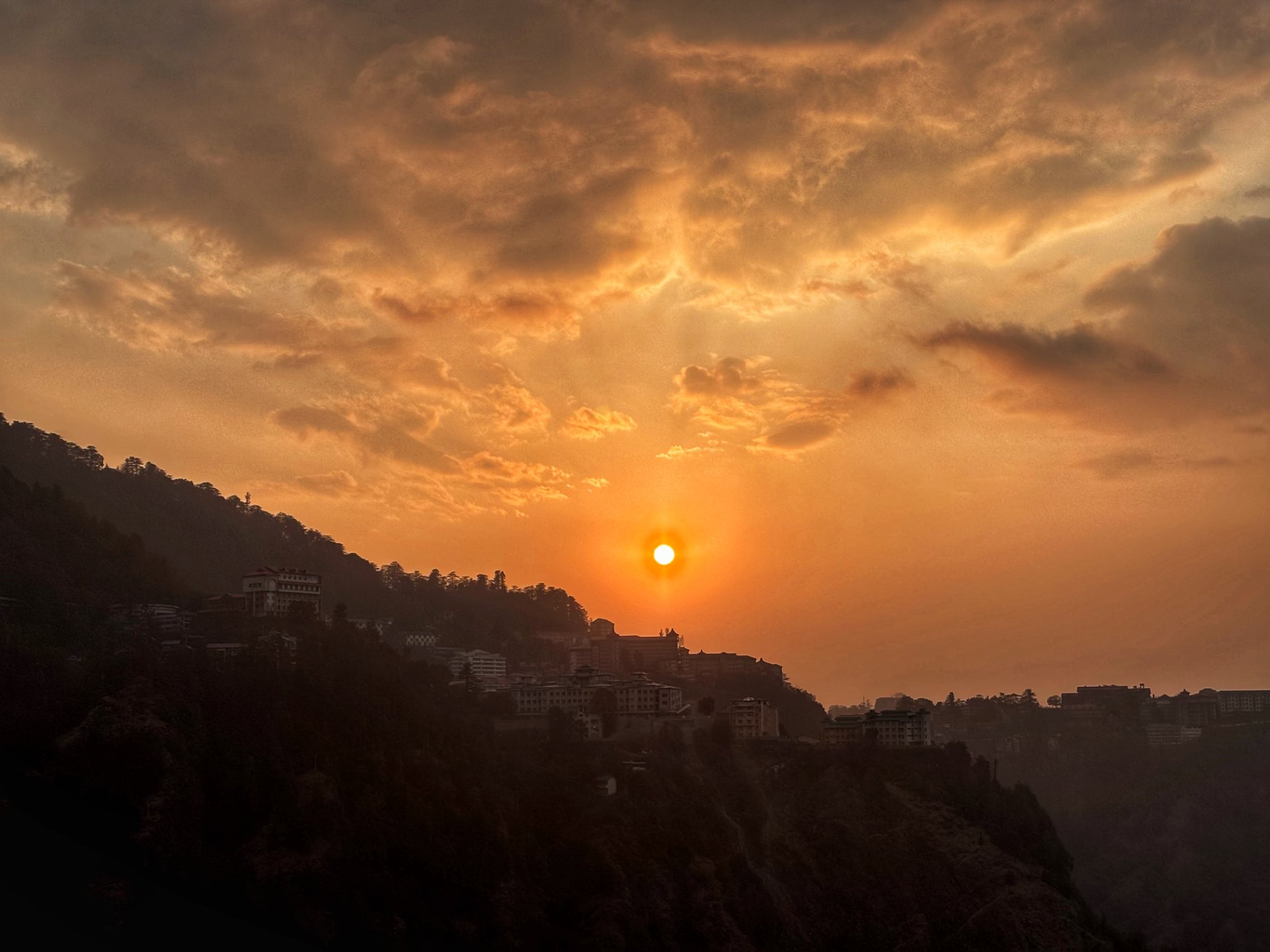 The hills below were slowly turning into dark silhouettes, and the buildings on the ridge looked tiny against the wide, glowing sky.The orange light spread everywhere, wrapping the whole scene in warmth.