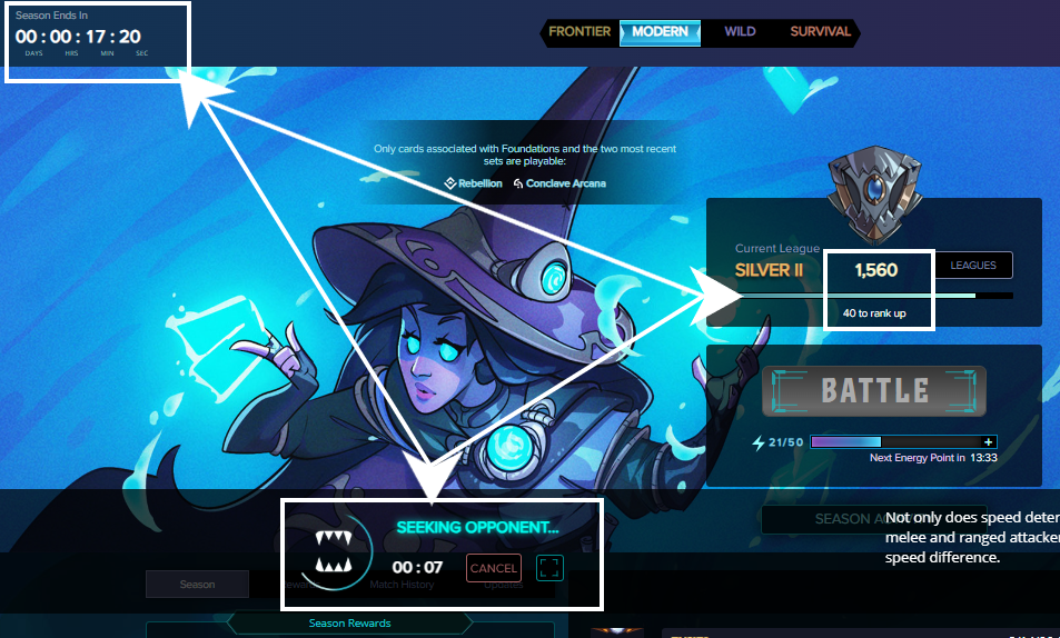 This was my best season yet—and now you can't even dismiss it as mere excuses, because I have the proof. Before this, I had never managed to climb above a ranking of 1500—a ranking that corresponds to the Silver 2 tier. From that point, one needs a mere 100 points to unlock Silver 2; yet, I could never seem to get past that threshold. In fact—to be honest—I had only reached the 1500 mark once before; subsequently, I couldn't seem to climb above the 1000–1200 range. But this time, not only did I shatter my previous record of 1500, but I also succeeded in earning the additional 100 points required to unlock Silver 1. It was such a magical experience that words simply fail me. In the screenshot displayed below, you can see the "Opponent Seeking" screen for that final, decisive battle. I’d also like to draw your attention to the top-left corner, where the remaining time for the season is displayed: there were just 17 minutes left on the clock. I was sitting at a ranking of 1560, and—since I had already won two or three battles in a row—winning this particular battle would net me 40 points. In other words, winning this battle was absolutely critical. 🔥