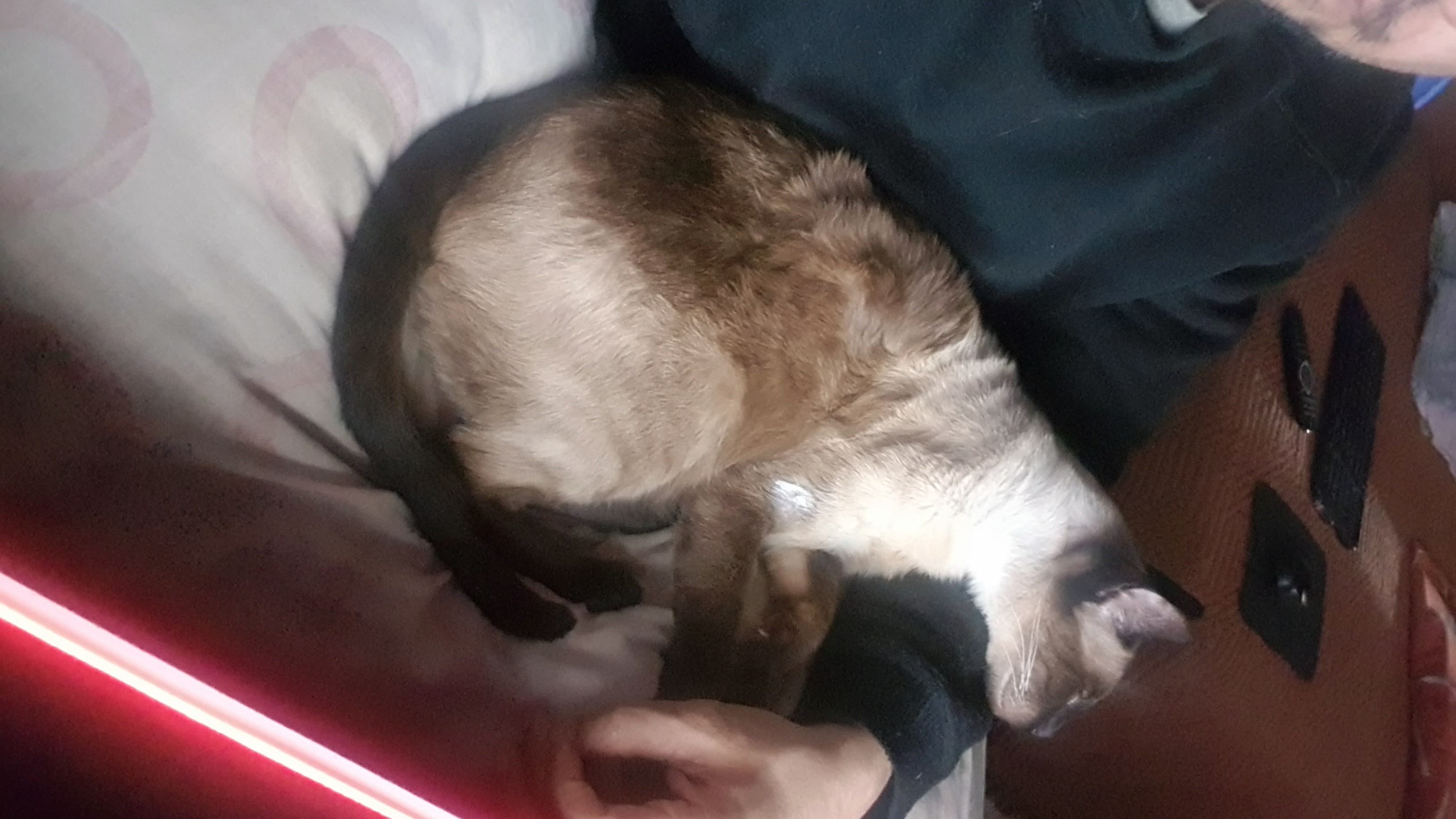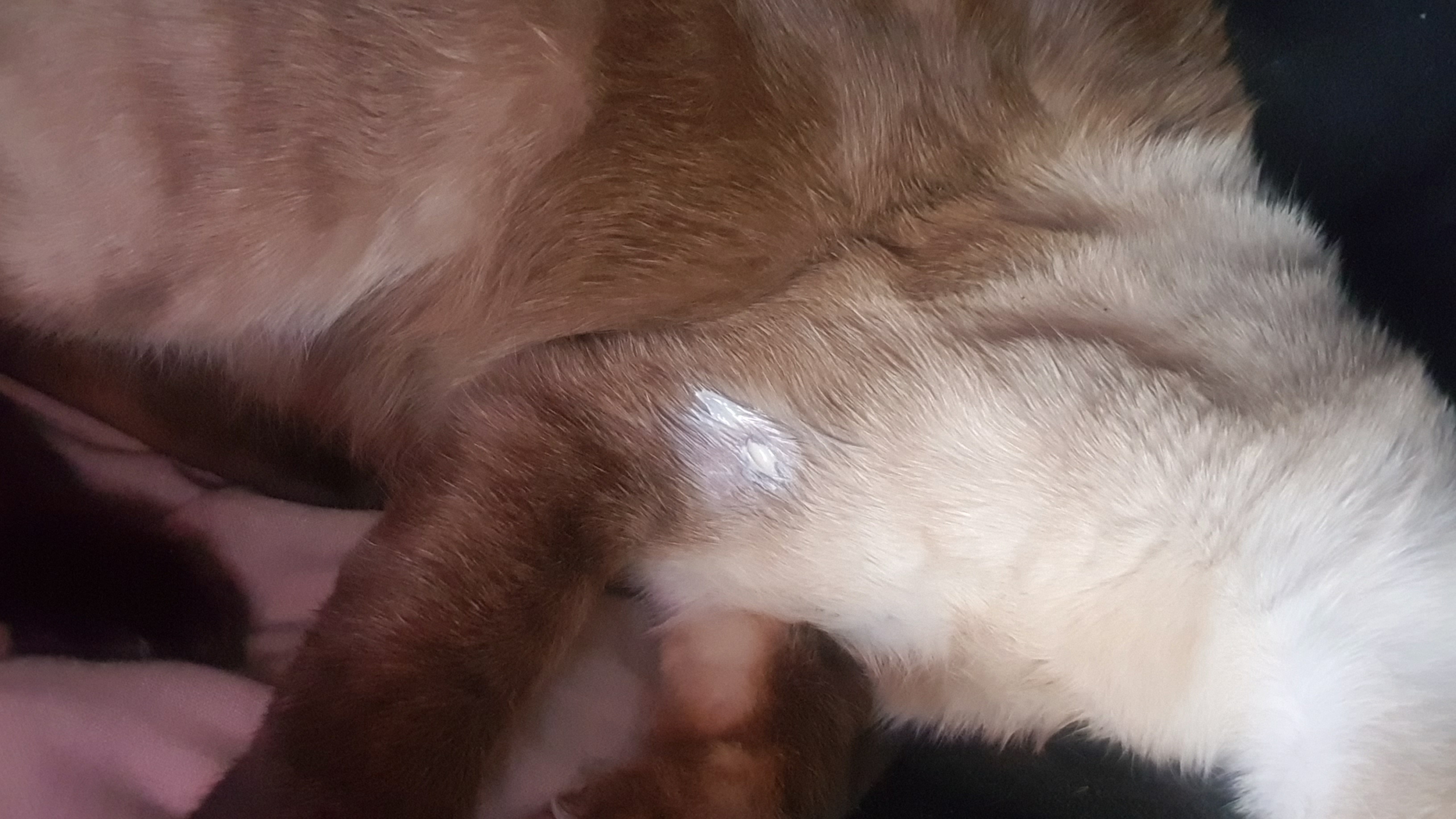 When I took him to the vet, they performed a puncture and extracted pus. They gave him some vaccines and then let him go home. After that, he just slept and, of course, was always on top of me. When he slept, I applied the cream his doctor gave me to help him heal. I was worried because he sometimes bled and more pus came out, but he told me it's normal for that to happen until everything inside him oozes out.