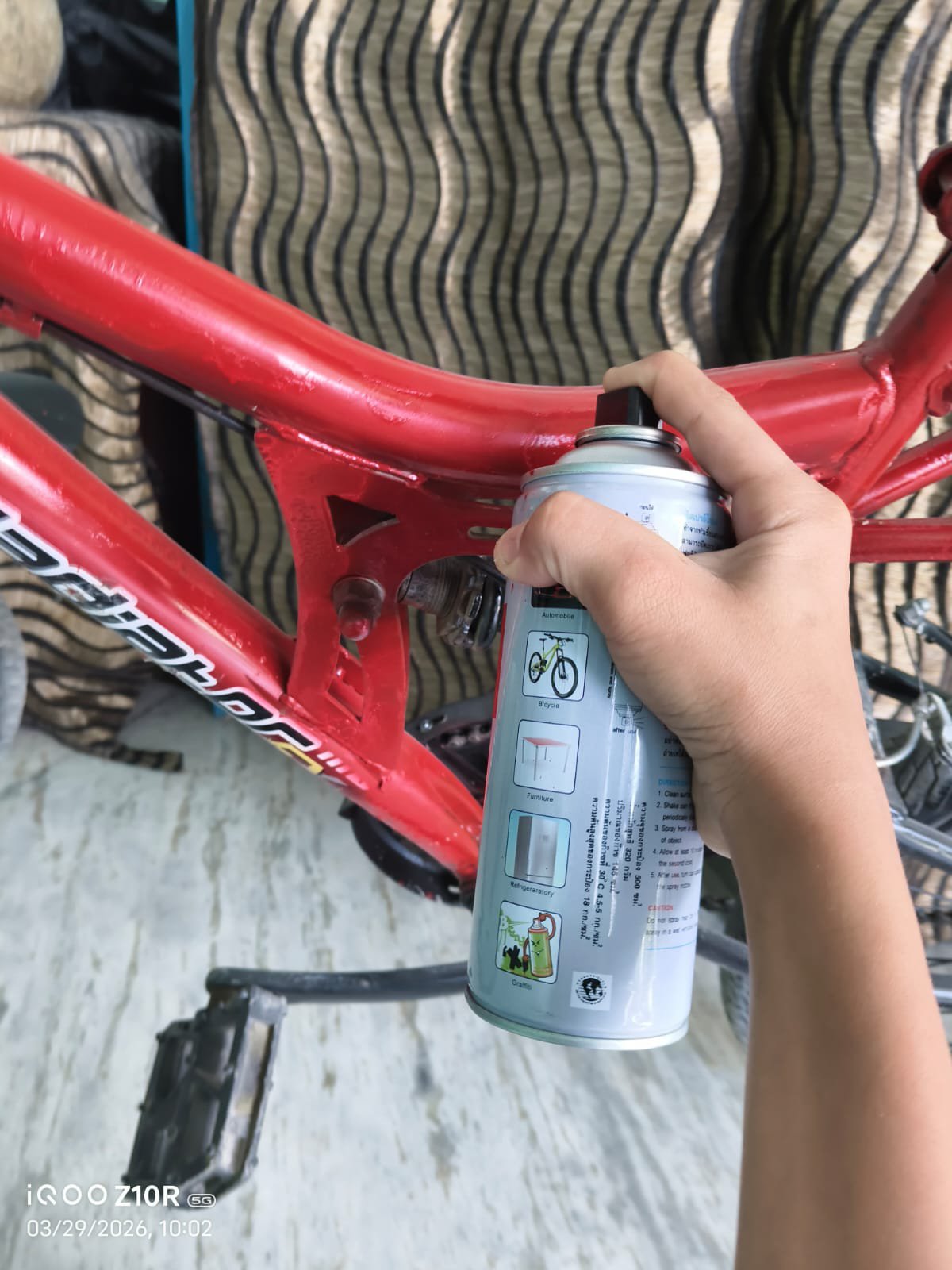 Then I sprayed red colour spray on my cycle frame and the upper body. The red spray colour was not totally red in colour because its colour type was orange-red, which changed the colour of the cycle frame. And where there was less space to spray, I painted there with a small, thin paintbrush.